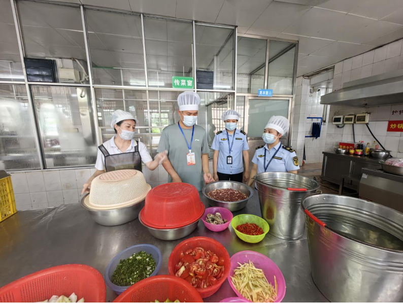 图为融安县市场监管局会同本地部分对中考考点学校食堂开展食物平安查抄。该局担任人暗示,“正在陪餐过程中,餐桌上,确保后续供餐质量。公费采办餐食,浮石镇初级中学食堂内,